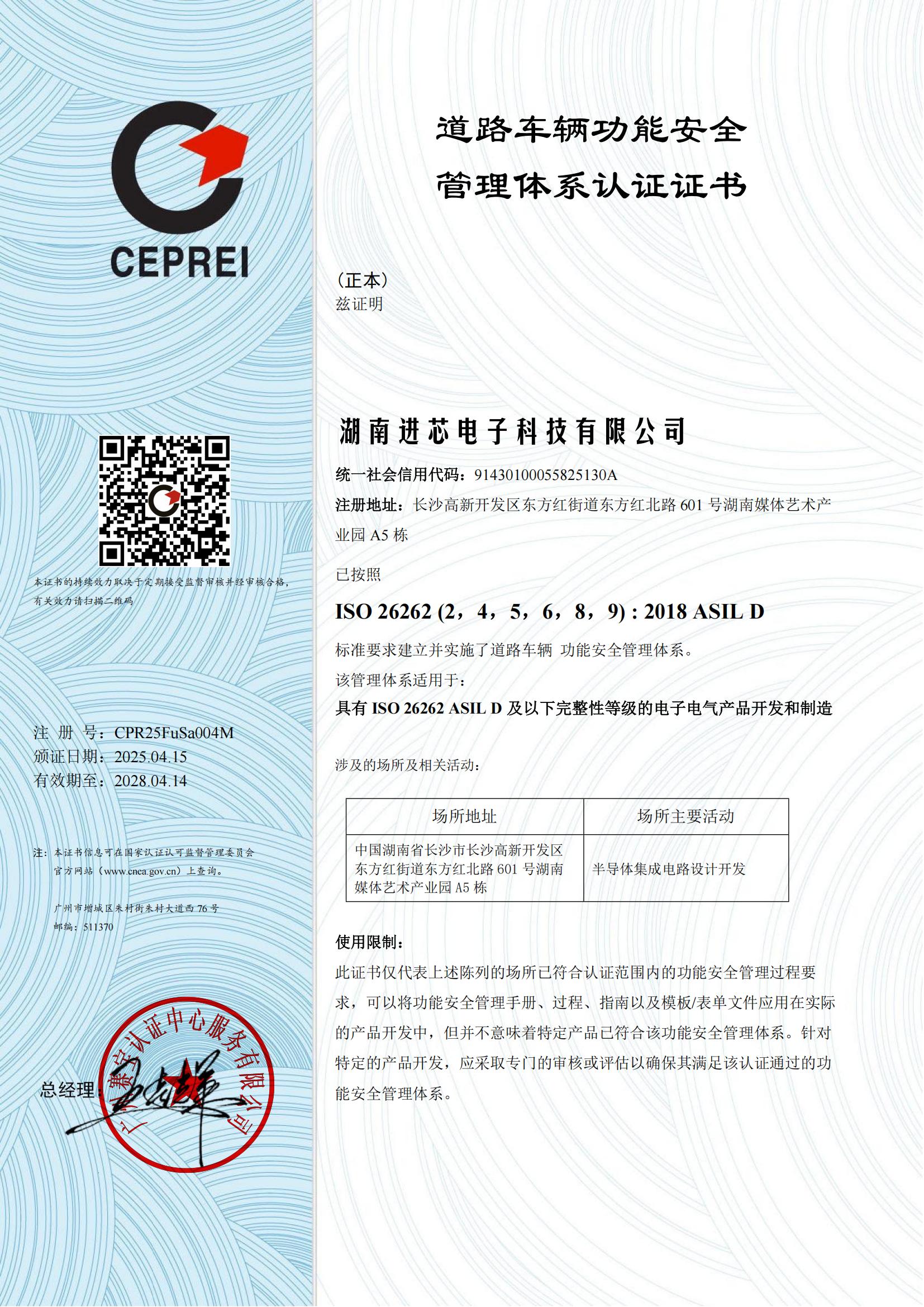 近日,進芯電子成功獲頒“ISO 26262 道路車輛功能安全管理體系認證證書”,此次認證標志著進芯電子在功能安全管理體系方面達到了全球公認的標準。