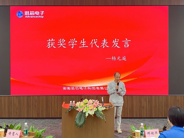 “進(jìn)芯電子獎(jiǎng)學(xué)金”獲獎(jiǎng)學(xué)生代表發(fā)言,他感謝進(jìn)芯電子對(duì)青年學(xué)子的支持,感謝學(xué)校對(duì)自身的培養(yǎng),表示深耕專業(yè)知識(shí)、厚植家國(guó)情懷是成才的必經(jīng)之路,他將再接再厲,勇創(chuàng)佳績(jī)。