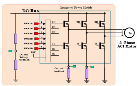 ADP32Fx 的 PWM 模塊運用 SVPWM 技術(shù)產(chǎn)生 6 個脈寬調(diào)制(PWM)信號,用于驅(qū)動 6 個功率開關(guān)器件。ADC 模塊采樣電機兩個相線的電流信號 Ia 和 Ib。通過電阻分壓的方式將直流母線的電壓送到芯片的 AD 引腳。