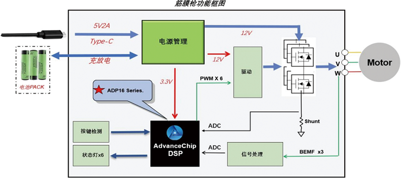 筋膜槍解決方案基于進芯ADP16F03系列高性價比16位DSP芯片,實現(xiàn)手持筋膜槍的多種智能控制。