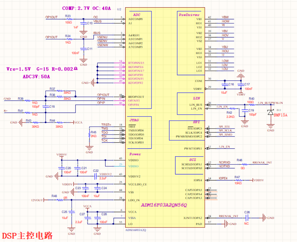 電路模塊主要包括: 輸入防反及濾波電路部分、24V轉(zhuǎn)12V系統(tǒng)供電電路(24V方案)、ADM16F03A2最小系統(tǒng)、功率橋電路、ADC母線電壓采樣電路、單電阻采樣運(yùn)放采樣電路、自舉電路和PWM/LIN通訊反饋電路。