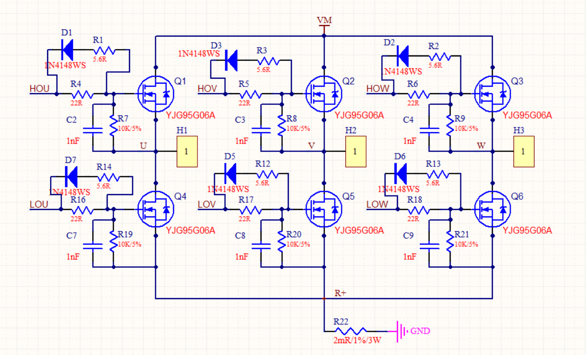 功率橋電路采用上下管均為NMOS的配置,總計(jì)6個(gè)NMOS組成三相半橋驅(qū)動(dòng)電路。