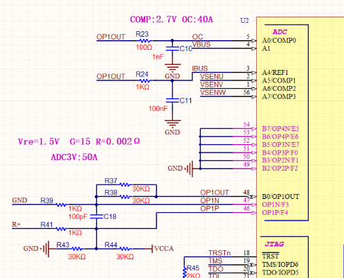 單采樣電阻0.001R/0.002R,通過差分走線至ADM16的OP1的獨(dú)立運(yùn)放電路進(jìn)行運(yùn)放輸入到芯片口采樣進(jìn)行運(yùn)算。