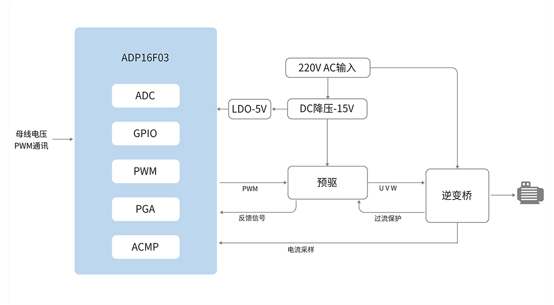 該方案具有強帶載啟動能力,弱磁升速功能,進出弱磁平滑;使用自主研發(fā)算法,讓控制更加平穩(wěn)、運行噪音更小。